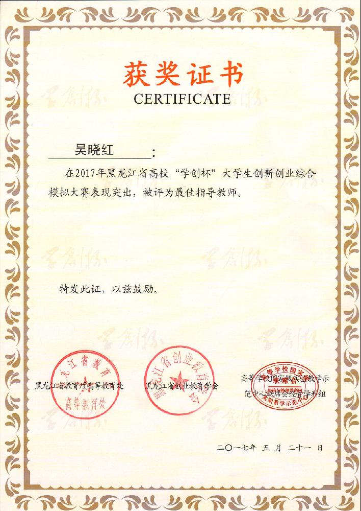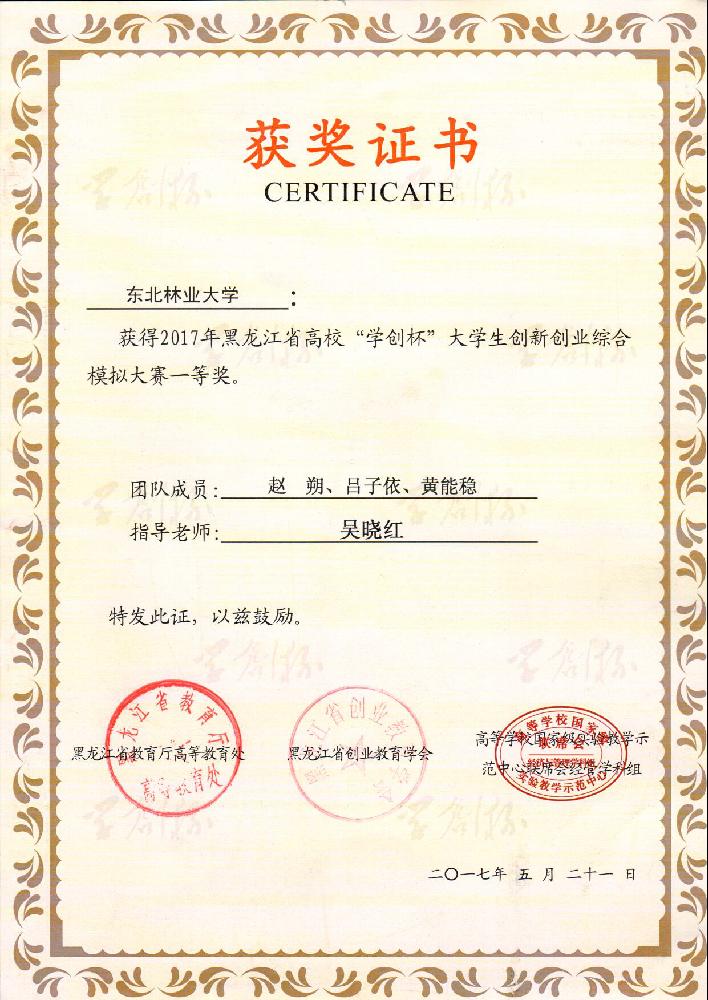 近日,2017黑龙江省“学创杯”大学生创新创业综合模拟大赛竞赛结果在黑龙江大学揭晓,3657.com交通工程专业组赵朔、黄能稳、吕子依荣获一等奖一项,项目指导教师吴晓红获得最佳指导教师奖。